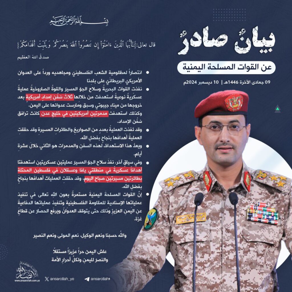 وأوضحت القوات المسلحة في بيان لها، أنها وفي إطار الانتصار لمظلوميةِ الشعب الفلسطينيِّ ومجاهديه والرد على العدوانِ الأمريكيِّ البريطانيِّ على بلدِنا، فقد نفذت القوات البحرية وسلاح الجوّ المسير والقوة الصاروخية عمليةً عسكريةً نوعيةً استهدفتْ من خلالِها ثلاثَ سُفُنِ إمدادٍ أمريكيةٍ بعد خروجِها من ميناءِ جيبوتي وسبقَ ومارست عدوانَها على اليمن.