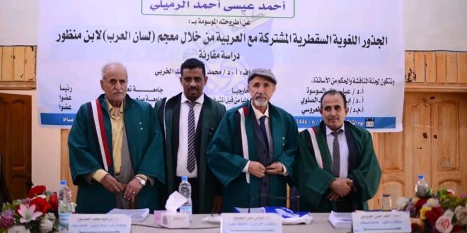 حصل الباحث اليمني احمد الرميلي السقطري اليوم على درجة الدكتوراه بامتياز من جامعة صنعاء كلية اللغات، وقد تم إجازة أطروحته المعنونة: الجذور اللغوية السقطرية المشتركة مع العربية من خلال معجم (لسان العرب) لابن منظور- دراسة مقارنة ..وتم بقاعة فلسطين بكلية اللغات جامعة صنعاء مناقشة رسالة الدكتوراه ،تحت إشراف ألاستاذ الفاضل الدكتور: محمد محمد الخربي.
