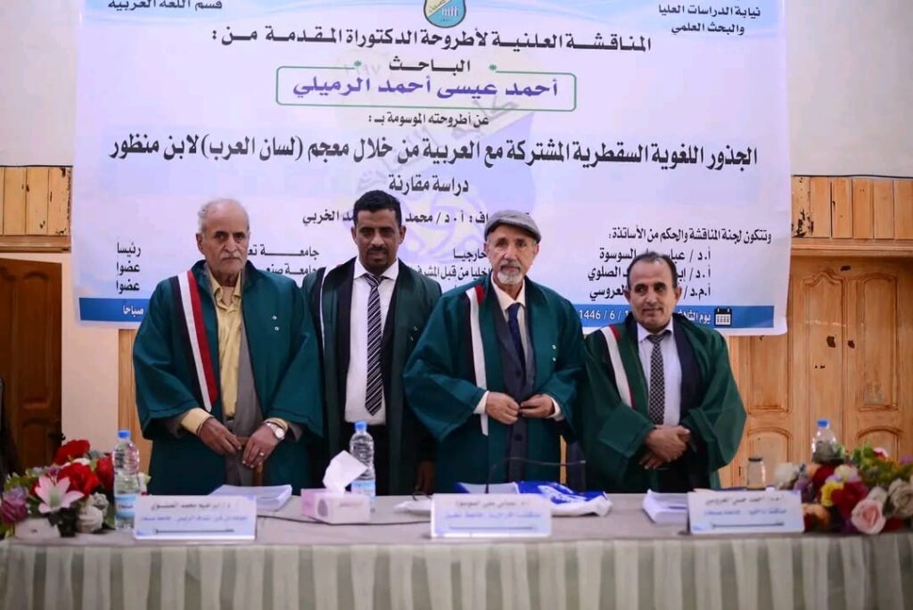 حصل الباحث اليمني احمد الرميلي السقطري اليوم على درجة الدكتوراه بامتياز من جامعة صنعاء كلية اللغات، وقد تم إجازة أطروحته المعنونة: الجذور اللغوية السقطرية المشتركة مع العربية من خلال معجم (لسان العرب) لابن منظور- دراسة مقارنة ..وتم بقاعة فلسطين بكلية اللغات جامعة صنعاء مناقشة رسالة الدكتوراه ،تحت إشراف ألاستاذ الفاضل الدكتور: محمد محمد الخربي.