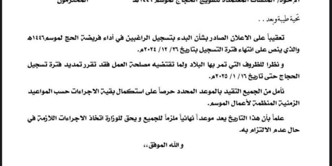 تجدر الإشارة إلى أن وزارة الأوقاف والإرشاد في العاصمة المؤقتة عدن أعلنت الثلاثاء الماضي تمديد فترة تسجيل الراغبين بأداء مناسك الحج حتى منتصف يناير من العام القادم.. مرجعة ذلك إلى الظروف التي تمر بها البلاد.