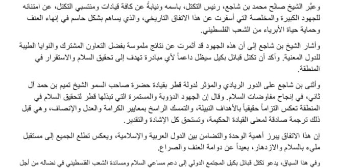 وفي هذا السياق، دعا التكتل المجتمع الدولي إلى دعم مساعي السلام ومساندة الشعب الفلسطيني في نضاله من أجل نيل حقوقه المشروعة، وحث كافة الجهات المعنية على الالتزام بالاتفاق والعمل على تنفيذه بكل دقة ومصداقية لضمان استمرار السلام والاستقرار.