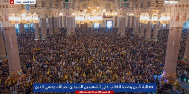 أدى الآلاف من أبناء الشعب اليمني، صباح اليوم الأحد، في جامع الشعب والساحات المحيطة به في ميدان السبعين صلاة الغائب على شهيدي الإسلام والإنسانية السيد حسن نصر الله والسيد هاشم صفي الدين رضوان الله عليهما.