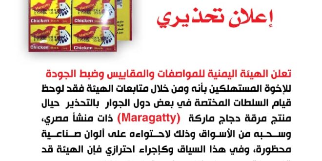 أصدرت الهيئة اليمنية للمواصفات والمقاييس وضبط الجودة تحذير للمستهلكين بعدم شراء منتج مرق دجاج ماركة ” Maragatty ” صناعة مصرية .