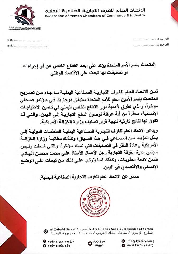 ثمن الاتحاد العام للغرف التجارية الصناعية اليمنية تصريحات المتحدث باسم الأمين العام للأمم المتحدة ستيفان دوجاريك بإبعاد القطاع الخاص اليمني عن أي إجراءات ” أو تصنيفات لها تبعات على الاقتصاد الوطني.
