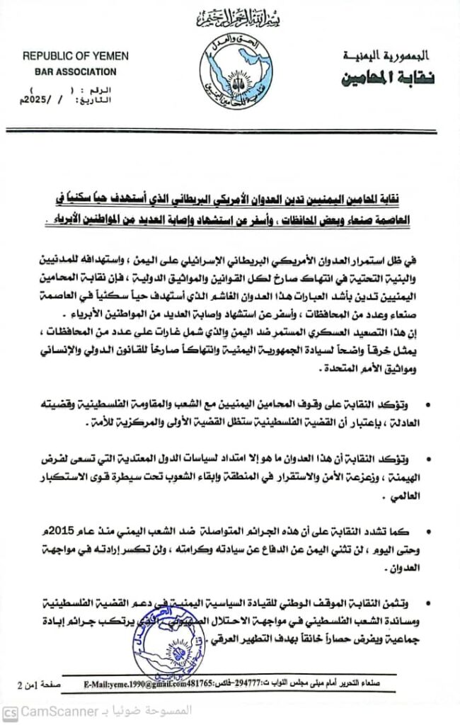 في ظل استمرار العدوان الأمريكي البريطاني الإسرائيلي على اليمن , واستهدافه للمدنيين والبنية التحتية في انتهاك صارخ لكل القوانين والمواثيق الدولية , فإن نقابة المحامين اليمنيين تدين بأشد العبارات هذا العدوان الغاشم الذي أستهدف حياً سكنياً في العاصمة صنعاء وعدد من المحافظات , وأسفر عن استشهاد وإصابة العديد من المواطنين الأبرياء.
