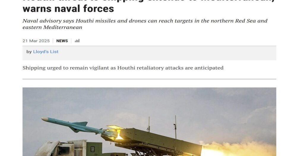 نقل موقع “لويدز ليست” البريطاني عن مركز المعلومات البحرية الغربي المشترك التحذير من أن الطائرات المسيّرة والصواريخ التابعة للجيش اليمني باتت قادرة على الوصول إلى أهداف في أقصى الشمال، بما في ذلك شرق البحر الأبيض المتوسط.