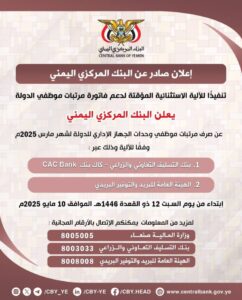 أعلن البنك المركزي اليمني في صنعاء، مساء اليوم السبت، عن بدء صرف مرتبات موظفي وحدات الجهاز الإداري للدولة لشهر مارس 2025م وفقاً للآلية الاستثنائية المؤقتة لدعم فاتورة مرتبات موظفي الدولة.