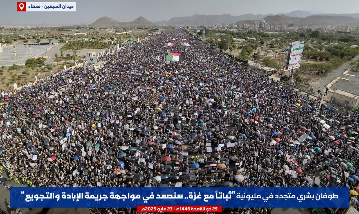 شهد ميدان السبعين بالعاصمة صنعاء ومختلف الساحات والميادين في المحافظات اليمنية، اليوم الجمعة، تظاهرات مليونية متجددة تأكيداً على ثبات الموقف اليمني المساند للشعب الفلسطيني ومقاومته حت شعار “ثباتًا مع غزة.. سنصعد في مواجهة جريمة الإبادة والتجويع”.