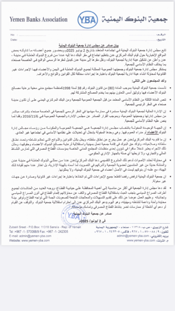 استنكر مجلس إدارة جمعية البنوك وجمعيتها العمومية الممثلة لجميع البنوك العاملة في اليمن والأعضاء فيها الإجراءات غير القانونية لمحاولة إنشاء هيئة إدارية لجمعية البنوك باعتبارها إجراءات مخالفة لكل القوانين واللوائح والنظام الأساسي للجمعية.