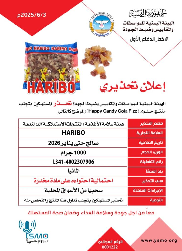 أصدرت الهيئة اليمنية للمواصفات والمقاييس وضبط الجودة تحذيرا للمستهلكين والتجار بعدم شراء أو بيع منتج حلوى هبي كاندي فييز مركة haribo ألمانية الصنع.