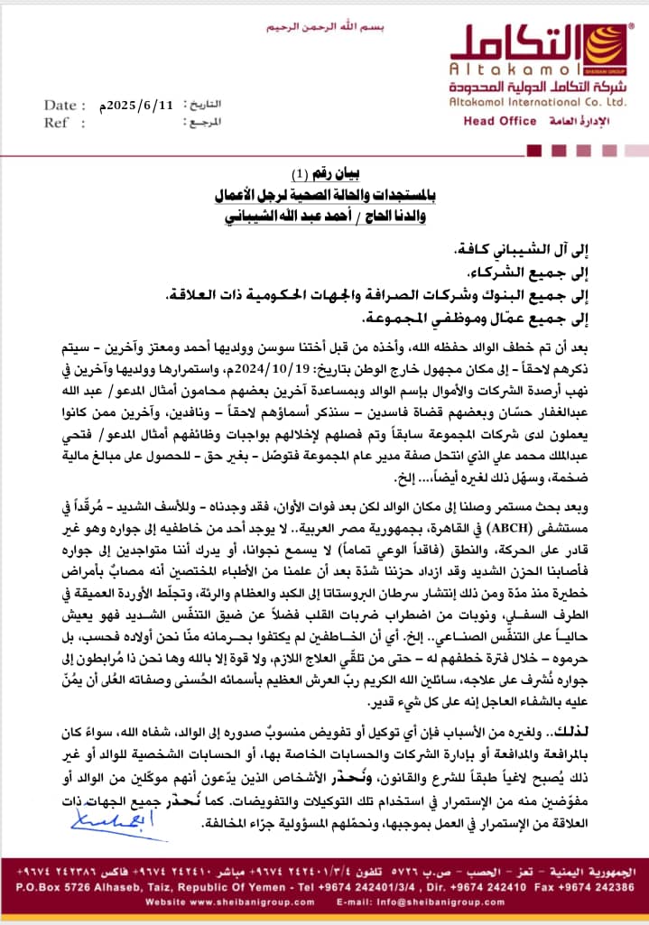 اصدر ابناء وبنات الحاج احمد عبدالله الشيباني بيان عائلي يوضح الحالة الصحية لوالدهم بعد التقائهم به بعد اختطاف دام اكثر من عامين ونصف العام ومن خلال البيان الذي وقع عليه ابناء وبنات الحاج جددوا تفويض اخيهم ابوبكر احمد عبدالله الشيباني بإدارة شئون المجموعة والغاء أي توكيل أو تفويض منسوب لوالدهم يخول الغير القيام بأي عمل من أعمال الادارة .