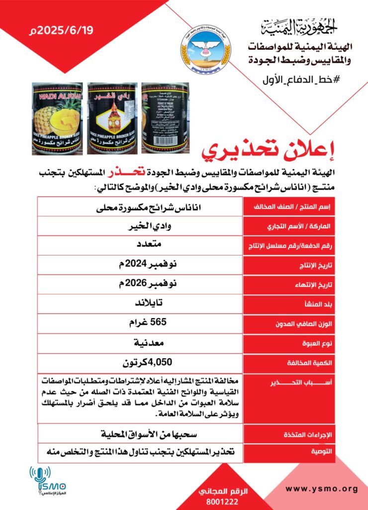 أصدرت الهيئة اليمنية للمواصفات والمقاييس وضبط الجودة بصنعاء تحذيرا للمستهلكين وأصحاب محلات البيع بعدم شراء أو بيع منتج أناناس شرائح مكسورة محلى ماركة وادي الخير- تايلندي الصنع.