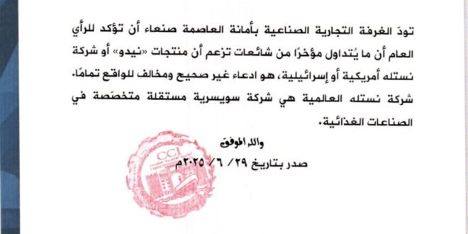 أصدرت الغرفة التجارية الصناعية بأمانة العاصمة اليوم توضيح حول منتج حليب نيدو