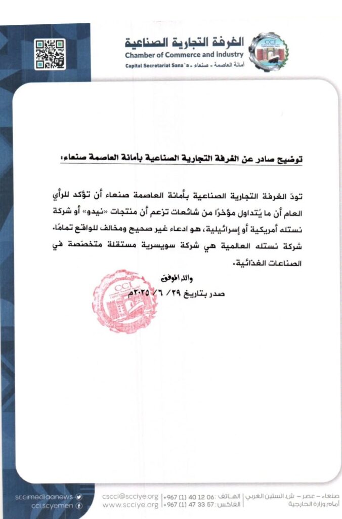 أصدرت الغرفة التجارية الصناعية بأمانة العاصمة اليوم توضيح حول منتج حليب نيدو