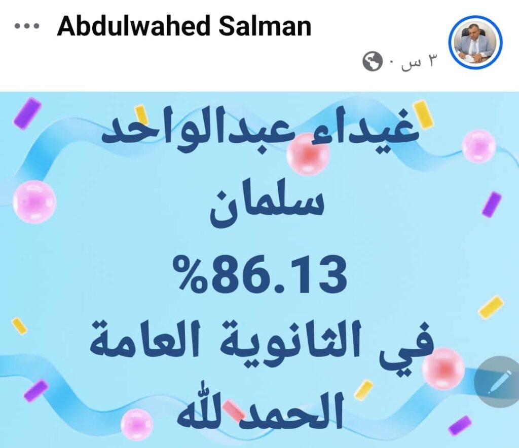حققت الطالبة غيداء عبدالواحد سلمان نجاحا وتفوقا مميزا في الثانوية العامة للعام الدراسي 1447 للهجرة وبلغت نسبتها 86.13% وبهذا النجاح المشرف تتقدم أسرة تحرير موقع اليمن الحر الاخباري للطالبة غيداء ولوالدها الاستاذ الخلوق عبدالواحد سلمان وكذلك لوالدتها الفاضلة وجميع افراد اسرتها الكريمة بأسمى آيات التهاني والتبريكات سائلين الله عز وجل أن يوفقها في مسيرتها العلمية المقبلة ومزيدا من التفوق والنجاحات والتألق الدائم بإذن الله تعالى