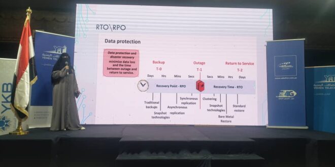 من جانبها قدمت المهندسة رقية أحمد الحمدي، مسؤولة إدارة الأنظمة في شركة سبأفون للاتصالات، ندوة بعنوان “التعافي من الكوارث في بيئة الاتصالات”،