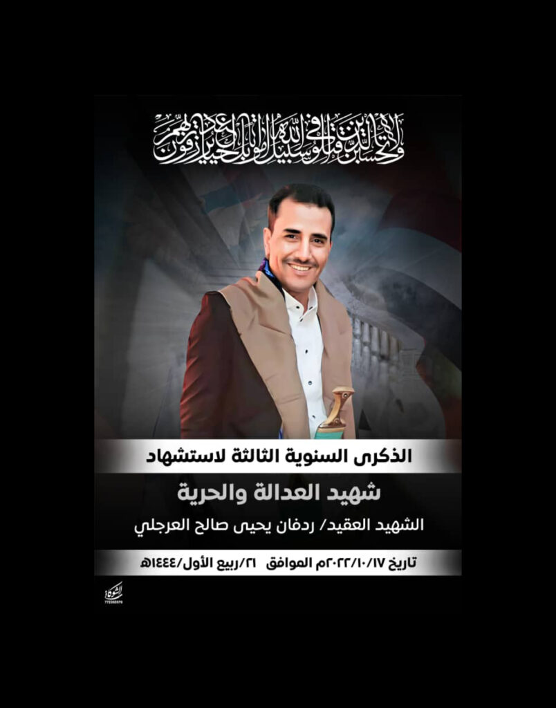 تصادف اليوم الجمعة الموافق السابع عشر من أكتوبر، الذكرى السنوية الثالثة لاستشهاد العقيد ردفان بن يحيى العرجلي، الذي ارتقى شهيدًا إثر إطلاق نار غادر من قبل عصابة عبدالمجيد الحوثي ونفذها المدعو القاتل بندر العسل “مدير فرع هيئة الاوقاف بمحافظة اب” بالتنسيق والدعم المباشر من المدعو عبد المجيد الحوثي “رئيس الهيئة العامة للأوقاف” ومحمد جحاف وكيل هيئة الاوقاف واللذين ارتكبوا جريمتهم النكراء في وضح النهار بوسط العاصمة صنعاء والتي أسفرت كذلك عن إصابة الدكتور ناصر بن يحيى العرجلي رئيس حزب اليمن الحر بجروح بليغةوبقى على اثرها وشقيقه الشهيد ردفان يحي العرجلي بالعناية المركزه بالمستشفى السعودي الالماني سبعه وعشرين يوما..حتى انتقل شقيقه الشهيد ردفان العرجلي إلى جوار ربه يوم 2022/10/17وذلك على خلفية انتقاد الدكتور العرجلي لممارساتهم وما يقومون به من الفساد والنهب والاستيلاء بدون وجه حق على أراضي وممتلكات المواطنين بمحافظة اب.