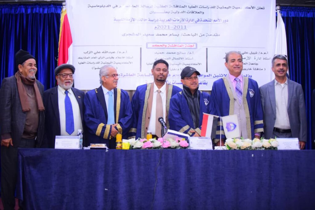 وأشادت اللجنة بمستوى الباحث وتميّزه في إعداد الرسالة، وما تضمنته من تحليل معمّق لدور الأمم المتحدة في إدارة الأزمات العربية، خصوصًا الأزمة الليبية، معتبرة أن الرسالة قدمت إضافة معرفية مهمة في مجال العلاقات الدولية والدراسات الدبلوماسية.