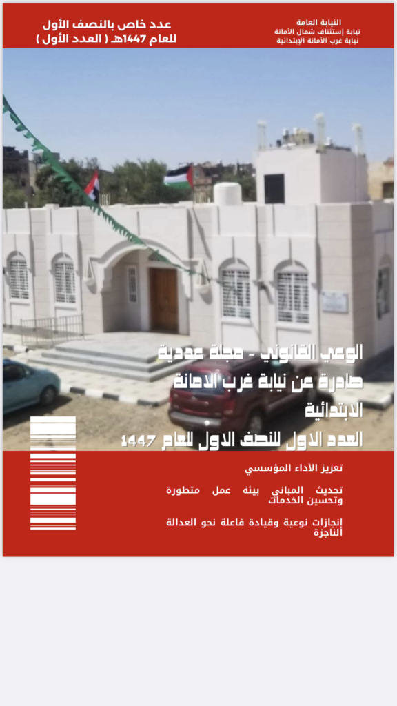 أصدرت نيابة غرب الأمانة بالعاصمة صنعاء العدد الأول من المجلة الإلكترونية “الوعي القانوني” بمواد توعوية متنوعة وتصميم فني ومهني جذاب يخدم المحتوى.