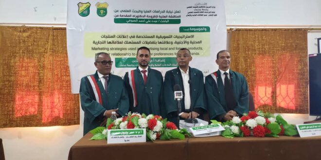 نال الباحث عبده علي أحمد الصوفي، اليوم الأربعاء، الدكتوراه مع مرتبة الشرف من قسم العلاقات العامة والإعلان بكلية الإعلام، جامعة صنعاء عن أطروحته الموسومة بـ «الاستراتيجيات التسويقية المستخدمة في إعلانات المنتجات المحلية والأجنبية، وعلاقتها بتفضيلات المستهلك لعلاماتها التجارية».