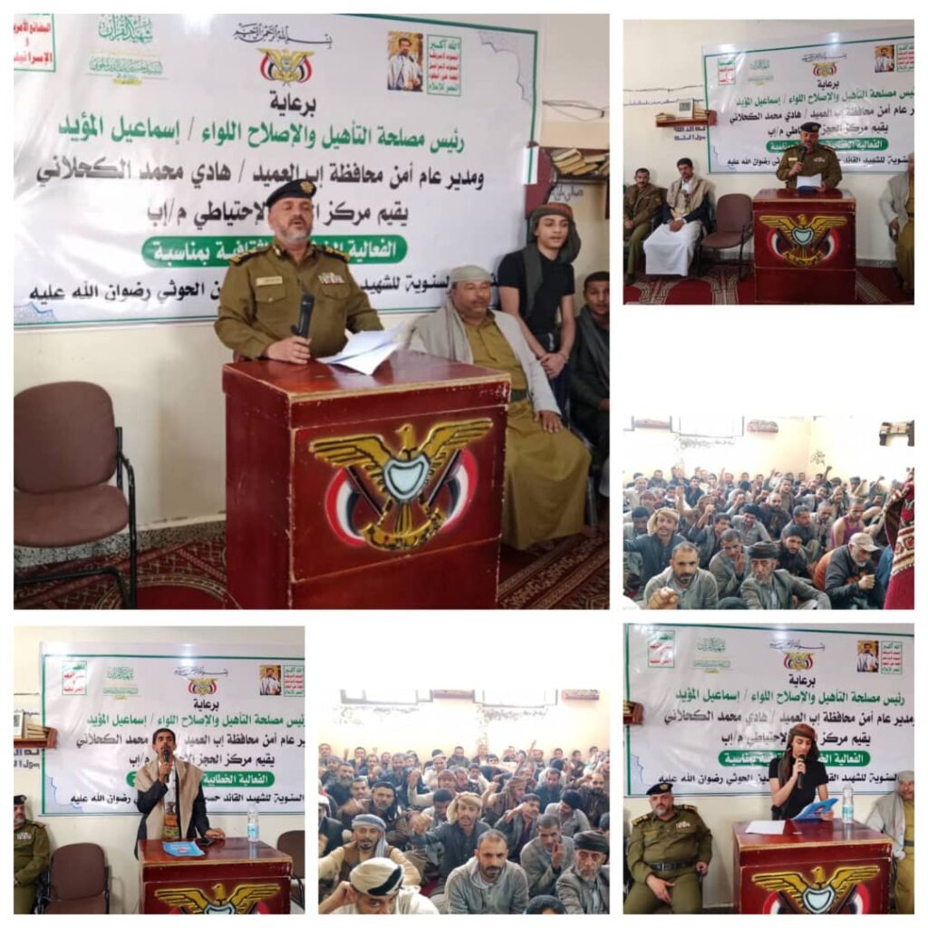 نظم الحجز الاحتياطي التابع لمصلحة التأهيل والإصلاح بوزارة العدل وحقوق الانسان بمحافظة إب اليوم، فعالية خطابية إحياءً للذكرى السنوية لشهيد القرآن، السيد حسين بدر الدين الحوثي (رضوان الله عليه) بين أوساط النزلاء