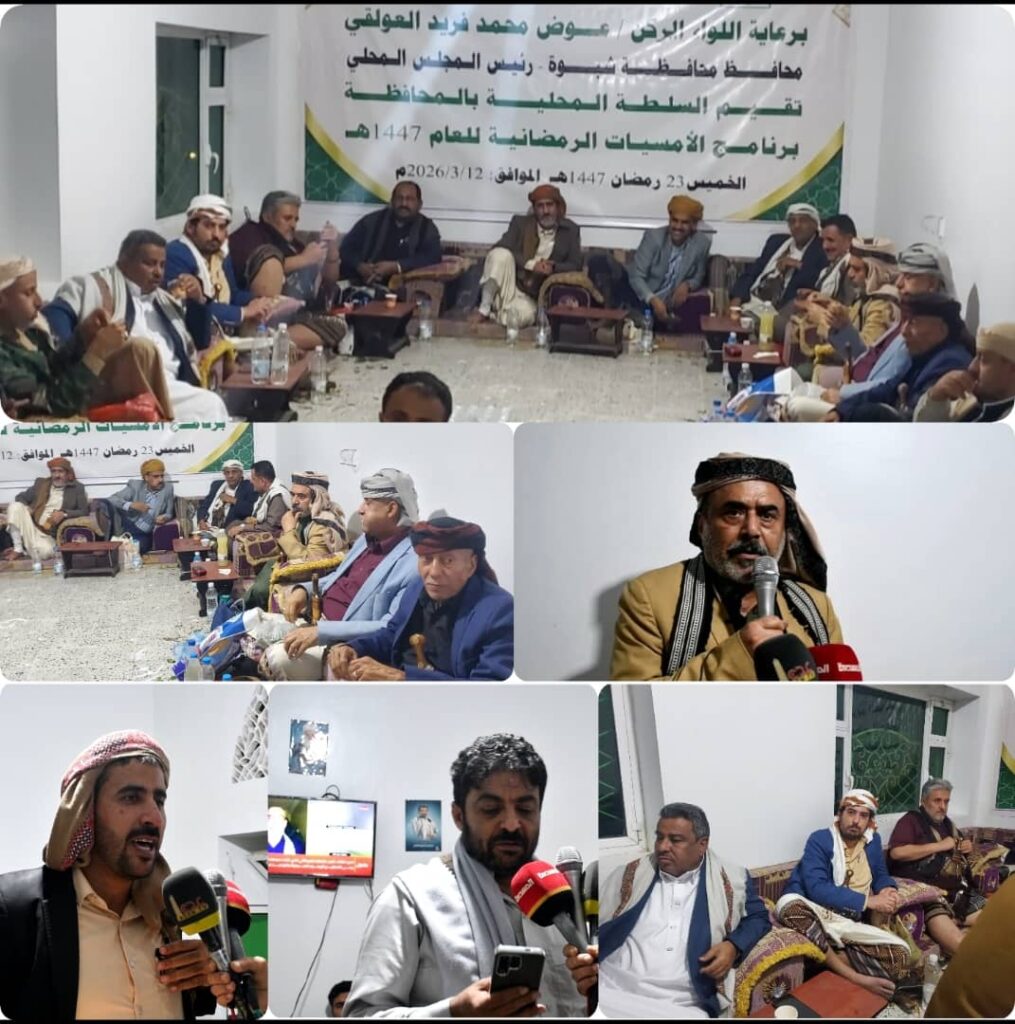 أحيت السلطة المحلية والمكتب التنفيذي بمحافظة شبوة أمسٍ برنامج الأمسيات الرمضانية للعام 1447هـ بأمسية رمضانية إحياءً لذكرى استشهاد أمير المؤمنين الإمام علي بن أبي طالب عليه السلام وذكرى يوم القدس العالمي.