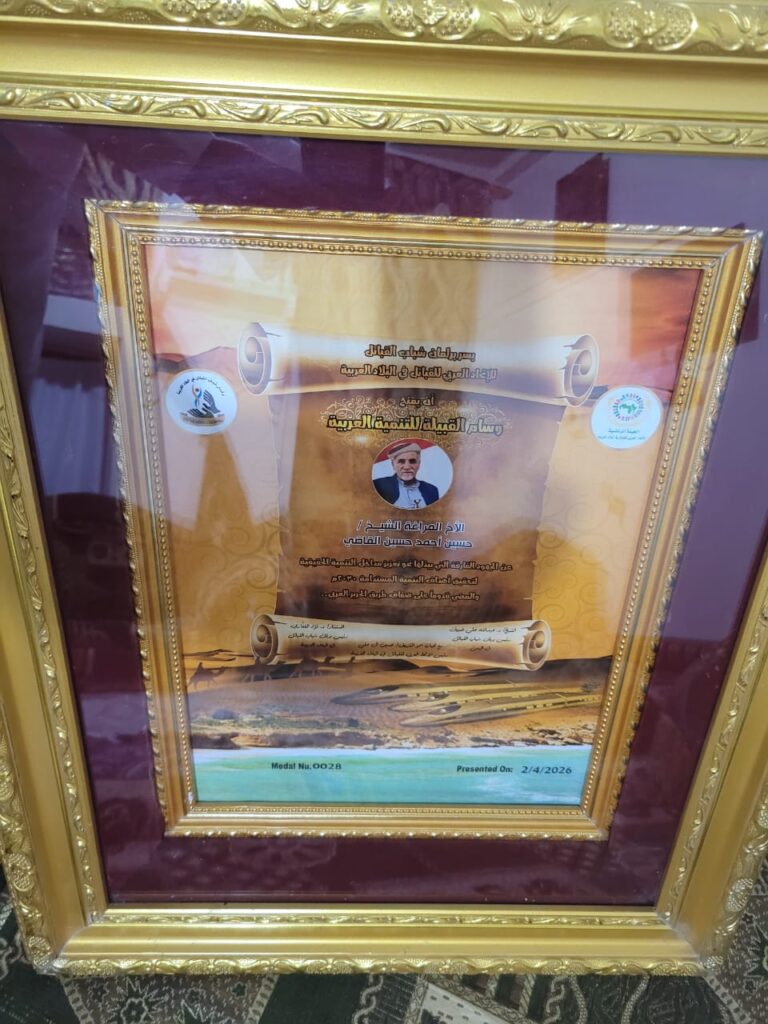منح الاتحاد العربي للقبائل العربية وبرلمان شباب القبائل العربية فرع اليمن وسام القبيلة للتنمية العربية للمراغة الشيخ / حسين احمد القاضى احد كبار ورموز مشائخ اليمن
