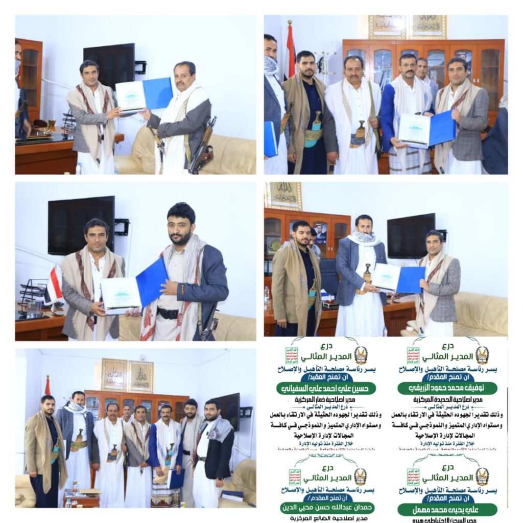 كرم وكيل مصلحة التأهيل والإصلاح بوزارة العدل وحقوق الإنسان العميد محمد محمد الفران ، أمس الثلاثاء مدراء الإصلاحيات المركزية بذمار العقيد حسين السفياني والحديدة المقدم توفيق الزريقي والضالع المقدم حمدان محيي الدين ومدير سجن هبره الاحتياطي بالامانة المقدم علي مهمل، بدروع وشهادات شكر وتقدير، نظرا لجهودهم وعملهم المتميز وإخلاصهم في أعمالهم خدمة للنزلاء.