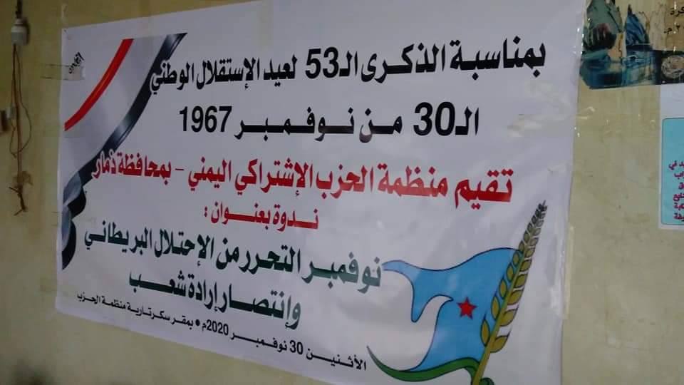 بمناسبة الذكرى ال53 لعيد الاستقلال الوطني 30 نوفمبر المجيد 1967 ، نظمت سكرتارية منظمة الحزب الاشتراكي اليمني بمحافظة ذمار ، مساء اليوم الاثنين 30 نوفمبر 2020 ، بمقر سكرتارية الحزب ندوة بعنوان :