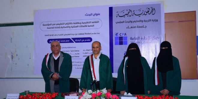 وشهدت قاعة مركز الإدارة العامة بجامعة صنعاء صباح اليوم الخميس المناقشة العلنية لرسالة الماجستير بعنوان “الثقافة التنظيمية وعلاقتها بالالتزام التنظيمي في المؤسسة العامة للاتصالات السلكية واللاسلكية بأمانة العاصمة صنعاء” كبحث مقدم استكمالاً لمتطلبات نيل درجة الماجستير التنفيذية في الإدارة العامة مقدمة من الباحثة سمر محمد عبدالله الكيال.