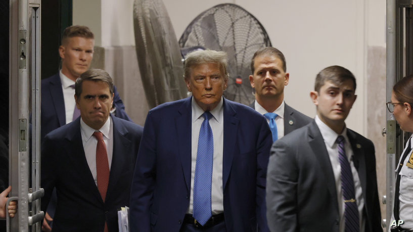 Former President Donald Trump walks with attorney Todd Blanche after a break during his trial at Manhattan Criminal Court on Monday, May 20, 2024 in New York. (Michael M. Santiago/Pool Photo via AP)