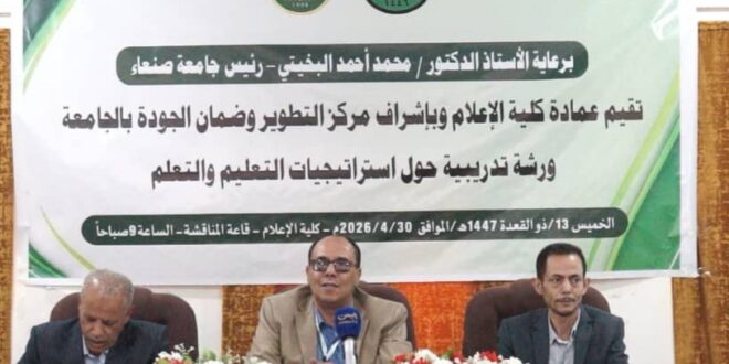 نظّمت كلية الإعلام بجامعة صنعاء، اليوم الخميس، ورشة عمل تدريبية حول “استراتيجيات التعليم والتعلم”، استضافت فيها الدكتور عارف الحمادي، الخبير الأكاديمي، لاستعراض آليات التدريس الحديثة في ظل هيمنة الذكاء الاصطناعي وخصائص الأجيال الجديدة.