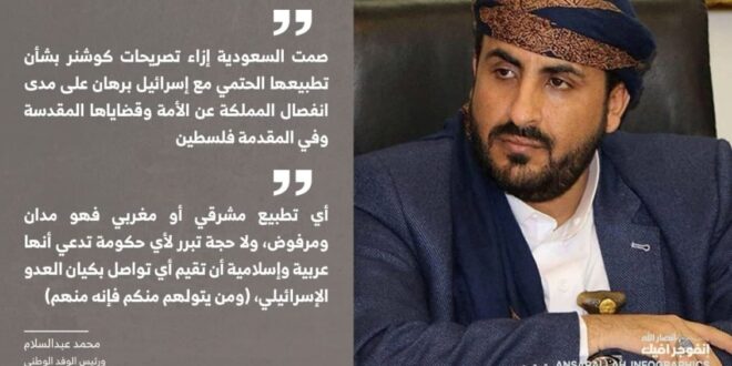 وقال محمد عبدالسلام في تغريدات له على تويتر: صمت السعودية إزاء تصريحات كوشنر بشأن تطبيعها الحتمي مع “إسرائيل” برهان على مدى انفصال المملكة عن الأمة وقضاياها المقدسة وفي المقدمة فلسطين”.