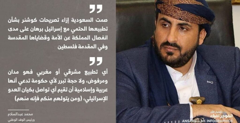 وقال محمد عبدالسلام في تغريدات له على تويتر: صمت السعودية إزاء تصريحات كوشنر بشأن تطبيعها الحتمي مع “إسرائيل” برهان على مدى انفصال المملكة عن الأمة وقضاياها المقدسة وفي المقدمة فلسطين”.