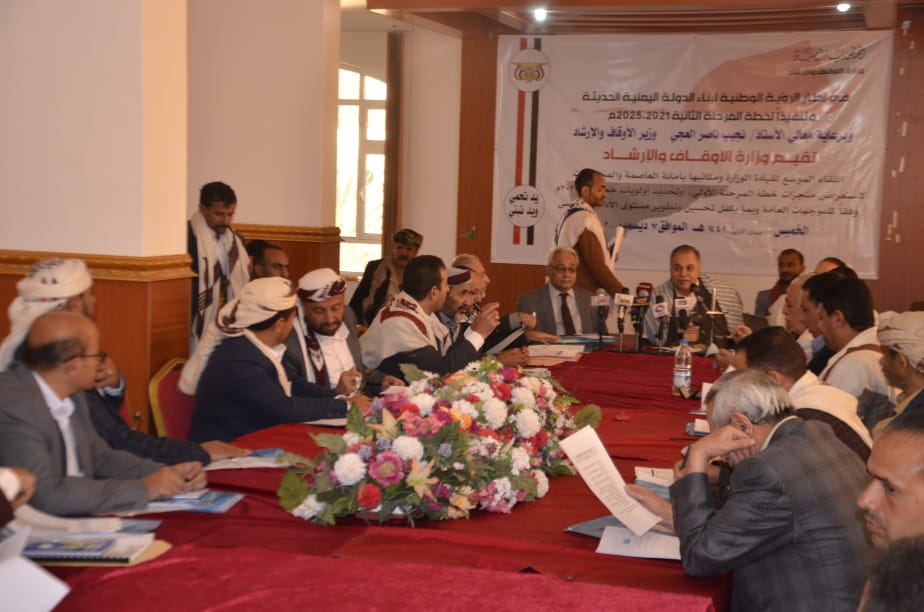 من جهته قدم الأخ عصام الحمزي تقرير تفصيلي عن مستوى التنفيذ و الانجاز لمشاريع الرؤية الوطنية حيث قال : نفذت وزارة الأوقاف والإرشاد مشاريع تنموية ضمن مشاريع خطة المرحلة (2020 – 2019م) الخاصة بالمرحلة الأولى للرؤية الوطنية لبناء الدولة، حيث بلغ عدد مشاريع الأوقاف المنفذة حسب الخطة حوالي خمسة عشر مشروعا تنمويا في عدة محافظات بتكلفة تقديرية تزيد عن ستمائة مليون ريال بتمويل ذاتي وحكومي.