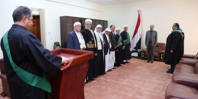 أدى اليمين القانونية أمام فخامة المشير الركن مهدي المشاط رئيس المجلس السياسي الأعلى اليوم الأثنين، عدد من القضاة بمناسبة تعيينهم أعضاء في المحكمة العليا، بحضور رئيس مجلس القضاء الأعلى القاضي أحمد المتوكل ورئيس المحكمة العليا القاضي عصام السماوي.