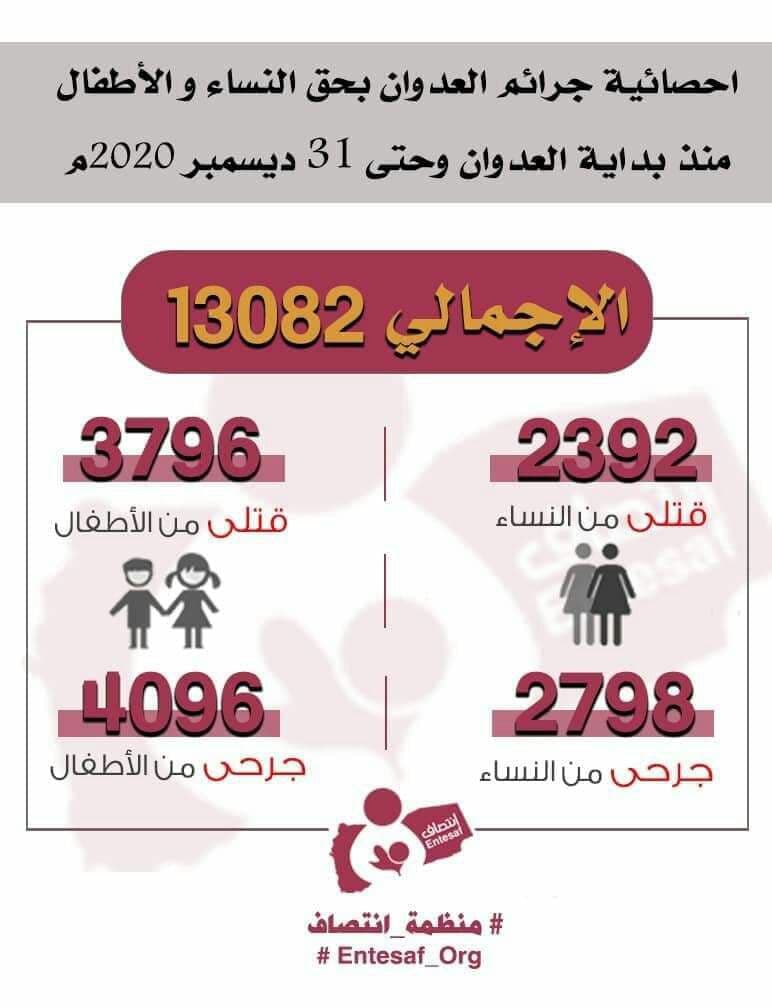 كشفت منظمة انتصاف لحقوق المرأة والطفل عن استشهاد وإصابة 13 ألف و82 طفلا وامرأة، جراء العدوان بصورة مباشرة منذ بداية العدوان على اليمن حتى 31 ديسمبر 2020م.