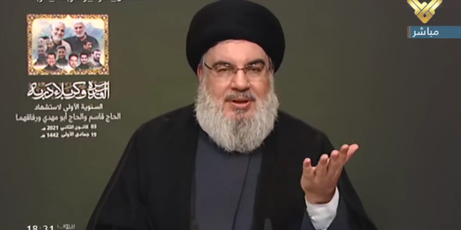 واكد السيد نصر الله ان هناك قلقا كبيرا اليوم في المنطقة والخليج، واسرائيل اعلنت رفع الجهوزية بسبب الذكرى السنوية لاستشهاد القائدين سليماني والمهندس والمنطقة في حالة توتر شديد ولا نعلم اي حادث إلى أين قد يؤدي.