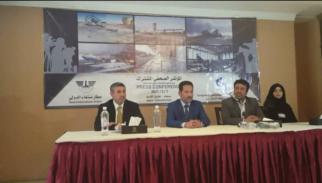من جانبه اكد المدير التنفيذي والإقليمي لمنظمة ايروبيان لحقوق الأنسان باليمن وليد العولقي سعي المنظمة إلى نقل معانآه الشعب اليمني ومظلوميته للعالم والمآسي والأضرار التي يتعرض لها بسبب العدوان وأستهداف المطار ومواصلة أغلاقة أمام المرضى والعالقين من المرضى والطلاب.