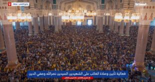 اليمن الحر/متابعات أدى الآلاف من أبناء الشعب اليمني، صباح اليوم الأحد، في جامع الشعب والساحات المحيطة به في ميدان السبعين صلاة الغائب على شهيدي الإسلام والإنسانية السيد حسن نصر الله والسيد هاشم صفي الدين رضوان الله عليهما. ونظمت فعالية التأبين في جامع الشعب بمشاركة رسمية وشعبية كبيرة، أقيمة خلالها صلاة …