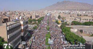 اليمن الحر شهدت العاصمة صنعاء عصر اليوم السبت ، مسيرة جماهيرية حاشدة في ساحة “باب اليمن” إحياءً لليوم الوطني للصمود في مواجهة قوى العدوان وتدشيناً للعام الثامن تحت شعار “والعاقبة للمتقين”. ورفعت الحشود الجماهيرية، الشعارات المعبرة عن صمود وثبات الشعب اليمني ووعيه الذي كسر رهانات قوى العدوان وأفشل مؤامراتها …