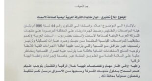 اليمن الحرالاخباري/ حذرت الهيئة اليمنية للمواصفات والمقاييس وضبط الجودة من خطورة استخدام ” اسمنت حضرموت ” لعدم مطابقتها للمواصفات . وأصدرت الهيئة بلاغا تحذيريا بشأن منتجات الشركة العربية اليمنية لصناعة الأسمنت ” اسمنت حضرموت – اسمنت العربية ” وقالت في التعميم ان تلك المنتجات غير مطابقة للمواصفات القياسية المعتمدة ويحمل …