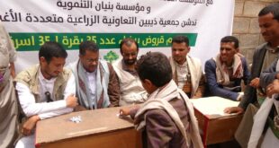 عمران-يحي الربيعي/ اليمن الحرالاخباري دشنت جمعية ذيبين التعاونية متعددة الأغراض توزيع عدد 35 بقرة على 35 أسرة ضمن مشروع القروض البيضاء بقيمة اجمالية تقدر بسبعة عشر مليون ريال تسدد على مدى 3 سنوات. وفي حفل التدشين الذي أقيم تحت إشراف اللجنة الزراعية والسمكية العليا ورعاية المؤسسة العامة للخدمات الزراعية …