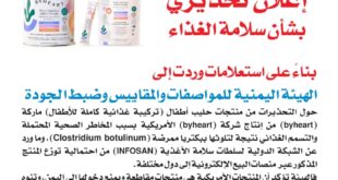 اليمن الحرالاخباري/عمر الصراري أصدرت الهيئة اليمنية للمواصفات والمقاييس وضبط الجودة، اليوم، إعلاناً تحذيرياً بشأن منتج حليب أطفال (تركيبة غذائية كاملة للأطفال) يحمل العلامة التجارية ByHeart ومنشؤه الولايات المتحدة الأمريكية، وذلك بعد ثبوت تلوثه ببكتيريا خطرة من نوع Clostridium botulinum، وما يترتب على ذلك من مخاطر صحية محتملة وتسمم غذائي …