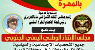 أكمل القراءة »مجلس الإنقاذ الوطني الجنوبي يدعو ابناء المهرة إلى المشاركة القوية في فعالية الجمعة الكبرى الرافضة لوجود القوا ت الأجنبية
