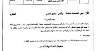اليمن الحر الأخباري/ تفاجأ طبيب يمني شهير في العاصمة صنعاء بقرار مدير مكتب الصحة بالأمانة، المتضمن فصله عن العمل بدون سابق إنذار، في خطوة تعسفية وغير أخلاقية وقانونية تعكس حجم التخبط الذي وصل إليه القيادات والمسئولين في القطاع الصحي. وفي فضيحة ادارية كارثية غير مسبوقة كشفتها مذكرة رسمية …