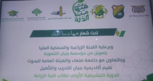اليمن الحرالاخباري دشنت مؤسسة بينان التنموية في قاعة علي بن زايد بكلية الزراعة- جامعة صنعاء الورشة التنشيطية الأولى لطلاب كلية الزراعة بالتعاون مع جامعة صنعاء والهيئة العامة للبحوث الزراعية وأكاديمية بنيان للتدريب والتأهيل. وفي حفل تدشين الورشة التي تستمر ثلاثة أيام برعاية اللجنة الزراعية والسمكية العليا أكد المدير التنفيذي لمؤسسة …