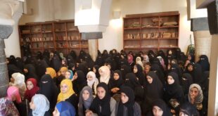 اليمن الحرالاخباري نفذت طالبات المدارس الصيفية بمديرية شعوب امس زيارة للجامع الكبير بصنعاء القديمة وتاتي الزيارة في اطار الأنشطة الصيفية المتنوعة التي تتميز بها الدورات حرصا منها على زيارة هذا الصرح الذي يعد معلمــًا تاريخيًا اسلاميًا لليمنيين وللأمة. وفي الزيارة استمعت الطالبات لشرح الأستاذ عبدالملك المروني مشرف الجامع الكبير عن …