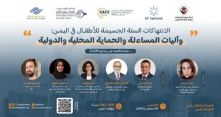 اليمن الحرالاخباري/ بمشاركة 30 مشاركة ومشارك وممثلين عن منظمات المجتمع المدني المحلية والدولية ذات الصلة وعن المؤسسات الحكومية والأحزاب السياسية والصحفيين والمؤسسات الأكاديمية عقدت يوم أمس الخميس على منصة زوم الرقمية جلسة نقاشية موسعة حول الإنتهاكات الستة الجسيمة للأطفال في اليمن وآليات المساءلة والحماية المحلية والدولية وخلال الحلقة النقاشية التي …