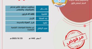 اليمن الحرالاخباري/ – رفضت الهيئة اليمنية للمواصفات والمقاييس وضبط الجودة شحنة بسكويت محشو بالتمر مدعم بالفيتامينات والمعادن مخالفة للمواصفات القياسية. وأوضحت الهيئة اليمنية للمواصفات والمقاييس وضبط الجودة في بلاغ صادر عنها اليوم ان الشحنة تبلغ ٤٧ ألف و٦٠٠ كرتون بسكويت محشو بالتمر مدعم بالفيتامينات والمعادن في فرع الحديدة بسبب مخالفتها …